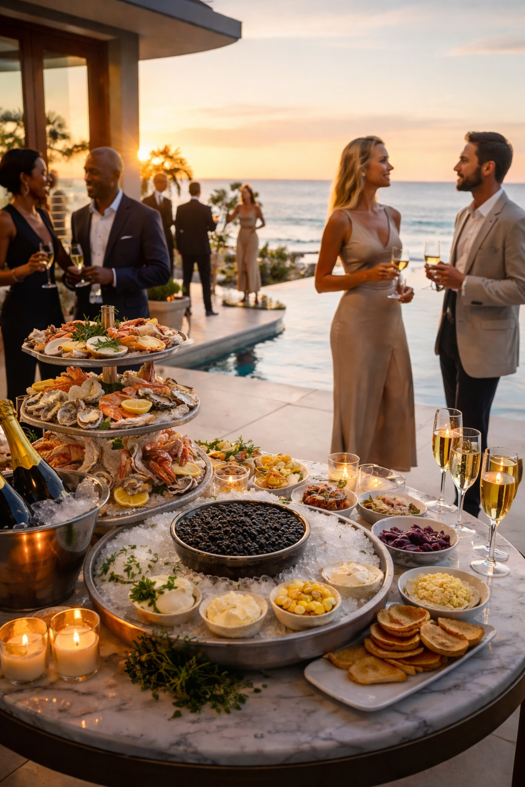 The evening centers on champagne, caviar, and a curated selection of elevated cocktails, served throughout the night in a continuous, unstructured flow. Each element is designed to feel indulgent yet balanced-delicate bites, pristine ingredients, and thoughtful pairings that enhance both the setting and the moment. The experience is less about formality and more about presence, conversation, and shared enjoyment.